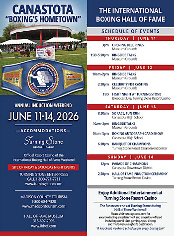 Many events will take place in Canastota and nearby Turning Stone Resort Casino throughout the four-day celebration including ringside talks, fist casting, fight night, 5K race / fun run, boxing