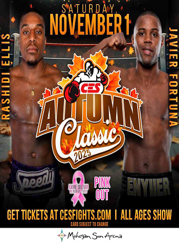 (October 15th) Saturday, November 1, CES Boxing returns to Mohegan Sun Arena with CES Autumn Classic 2025. This action-packed fight card is headlined by a world-class welterweight showdown between top contender "Speedy" Rashidi Ellis, of Lynn, MA and former world champion Javier "El Abejón" Fortuna.