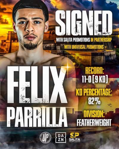 (October 7th) Undefeated featherweight Felix Parrilla has signed a multi-year promotional agreement with Salita Promotions in partnership with Universal Promotions, the companies announced.