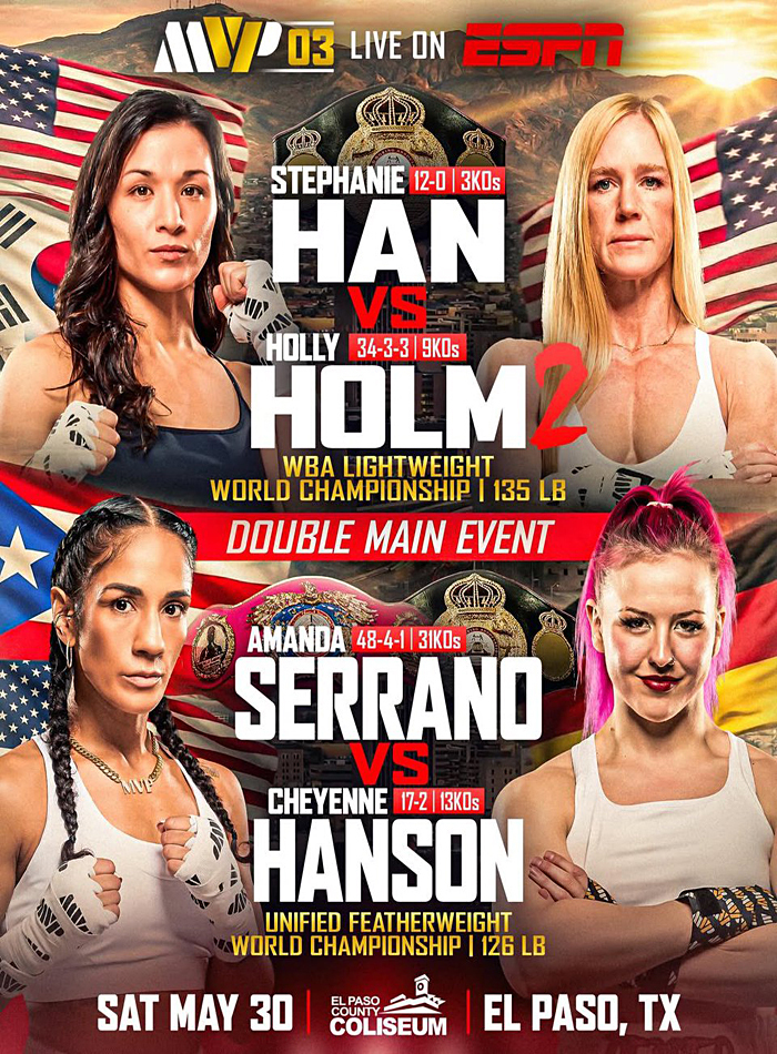 (April 7th) Most Valuable Promotions (MVP) has officially unveiled the full card for MVPW-03, a landmark 12-fight event scheduled for Saturday, May 30, 2026, at the El Paso County Coliseum. Broadcast live on ESPN with prelims streaming on ESPN+ and the MVPW App, the card features a blockbuster double main event and a quadruple world championship lineup, signaling a new era of high-profile, linear television exposure for the women’s game.
