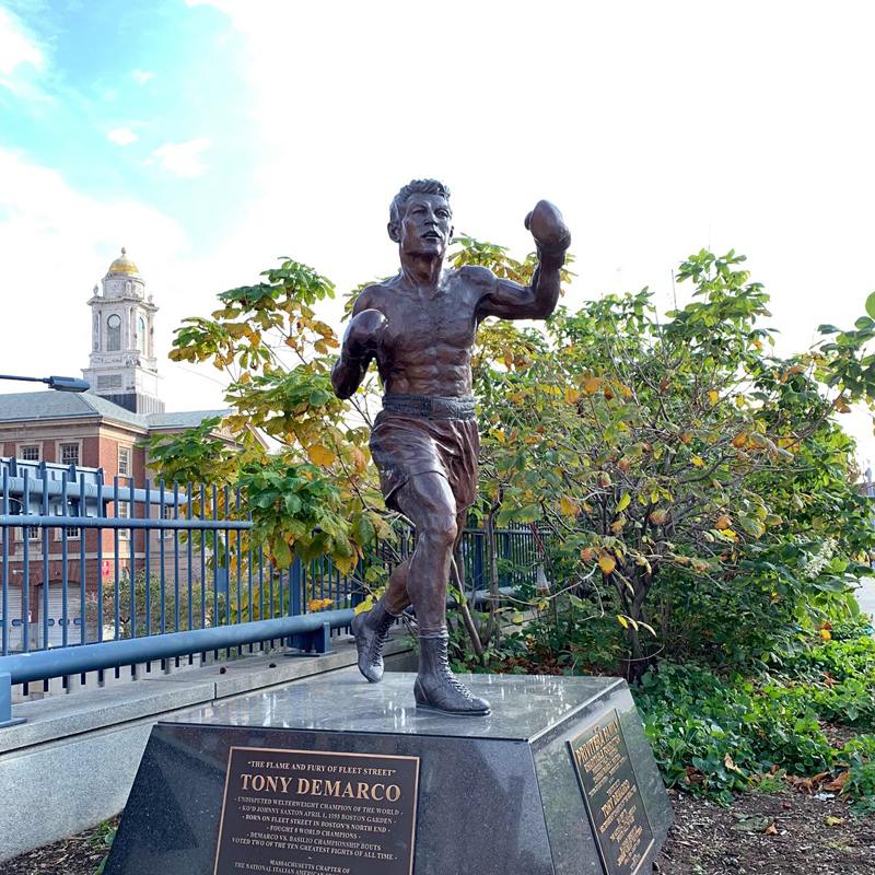 After a long and respected career, DeMarco fought his final bout on February 6, 1962, earning a ten-round decision over Stefan Redl in Boston. Over the years, he continued to be honored in his hometown. He trained under Boston legend Frankie Waters and routinely sold out the Boston Garden, setting attendance records. A local favorite, DeMarco was later honored by Mayor Thomas Menino with “Tony DeMarco Way,” a street named after him in the North End, and a statue at the corner of Hanover and Cross Streets, unveiled on October 20, 2012. The bronze monument, created by renowned sculptor Harry Weber, stands as a lasting tribute to Boston’s “Kid from the North End.”