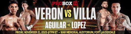 “We are bringing Francisco Veron back to ProBoxTV based on how phenomenal he looked dominating Vladimir Hernandez last July,” said ProBoxTV's founder and CEO, Garry Jonas. “Veron is a former Olympian seemingly on his way to becoming a threat to anyone in the 154-lb. division, but Villa is a very dangerous puncher who was highly regarded before he ran into some weight-based setbacks a couple years ago.”