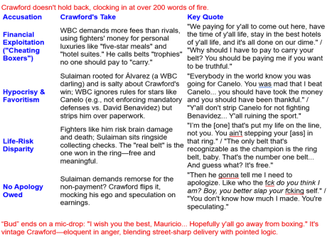 Crawford's outburst an "exposé" on WBC President Mauricio Sulaiman's alleged exploitation of fighters, emphasizing themes of financial gouging, favoritism, and the inherent risks boxers take versus the "easy money" sanctioning bodies collect.