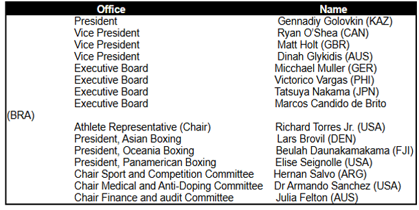 The four winners of today’s elections will join the World Boxing Executive Board which is made-up of the President; three Vice Presidents; four Executive Board members; four Continental Confederation Presidents; two Athlete Representatives; the Chairs of the Committees for Sport and Competition, Medical and Anti-Doping, and Finance and Audit.