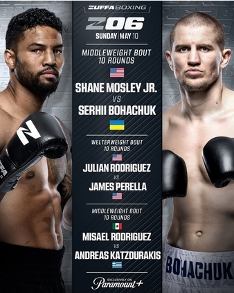 (April 7th) Zuffa Boxing has confirmed its next event, Zuffa Boxing 06, headlined by a middleweight clash between Shane Mosley Jr. and Serhii Bohachuk on Sunday, May 10, 2026, at the Meta Apex in Las Vegas. The event will stream live exclusively on Paramount+, with the three-fight main card scheduled to begin at 9:00 p.m. ET / 6:00 p.m. PT and preliminary bouts airing beforehand. Promoted by Dana White’s Zuffa Boxing and matched by Charles Bosecker, the eight-fight lineup represents the promotion’s sixth event since launching earlier in 2026.